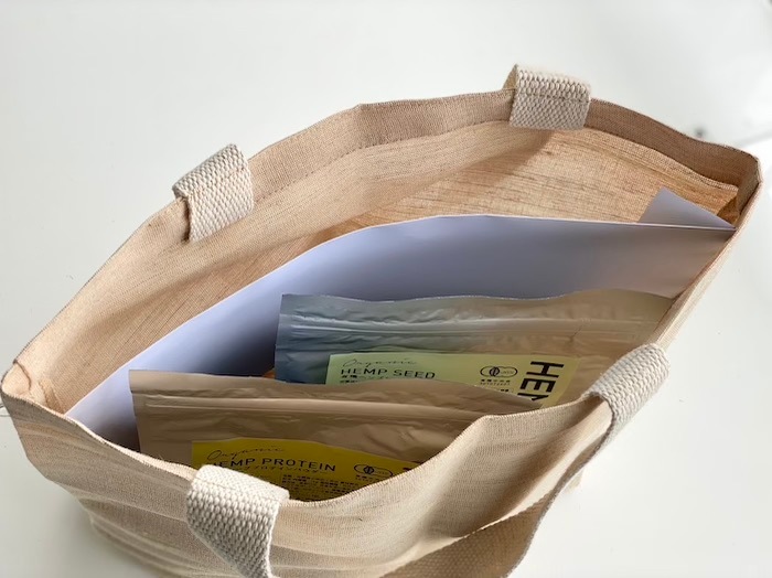 今年はグリーンとホワイトの2種類が登場!カジュアルシーンで活躍できる素朴なジュートとしなやかなコットンを織り交ぜたナチュラルトート。画像のようにA4サイズも入り、有機ヘンプシード1kgが2個もすっぽり収まります! くるっと丸めてお出かけバックに入れておけば急に荷物が増えてしまった時にも安心。
