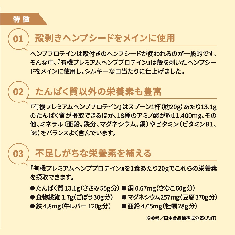 通常のヘンププロテインは殻付きの麻の実(ホール)を脱脂したあとに、微粉末化したものです。「有機プレミアムヘンププロテイン」は殻を剥いたヘンプシードをメインに脱脂・微粉末化したプロテインです。