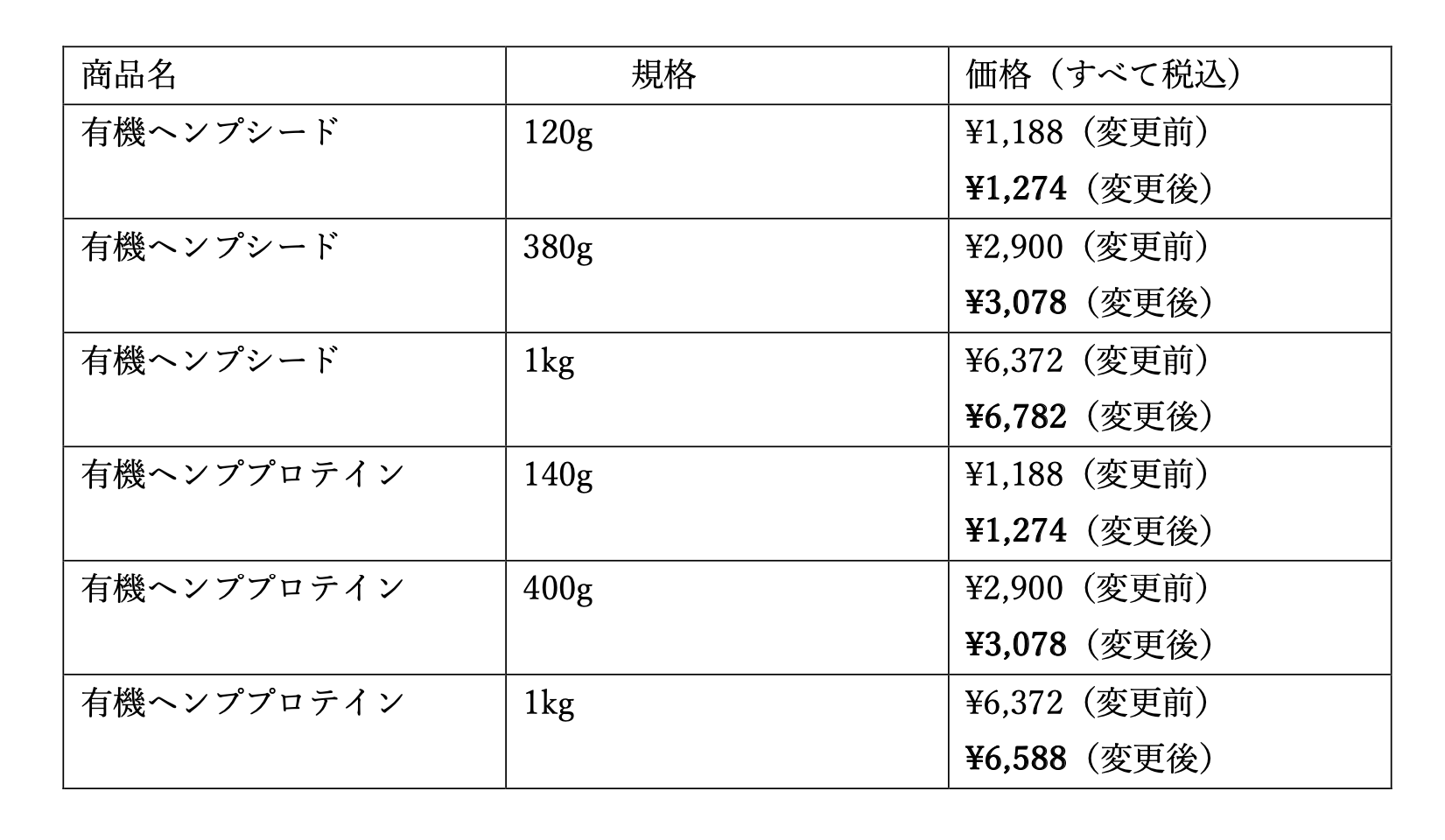 HEMPS 有機ヘンプシード/有機ヘンププロテイン 価格改定のお知らせ