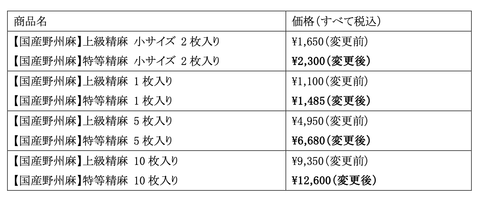 誠に心苦しい限りではございますが、価格を改定させていただくこととなりました。また、今後はより品質の高い精麻をお届けするため、これまで「上級精麻」として販売していた商品につきましては、野州麻の中でもより選別された「特等精麻」へと等級を変更し販売させていただく予定でございます。